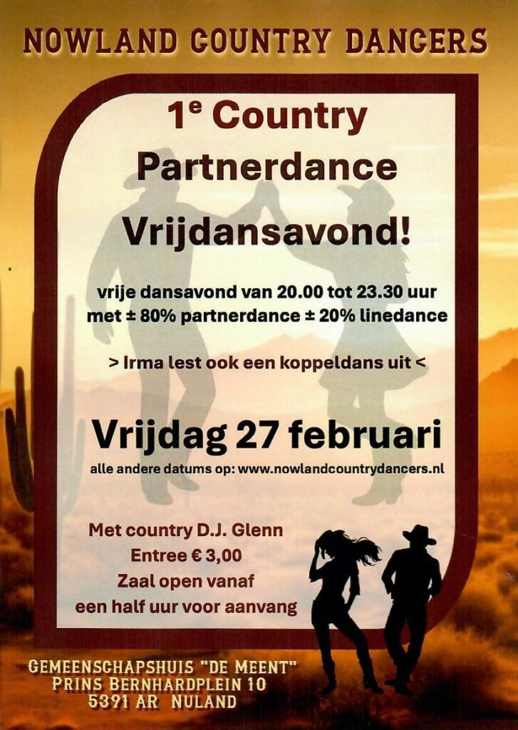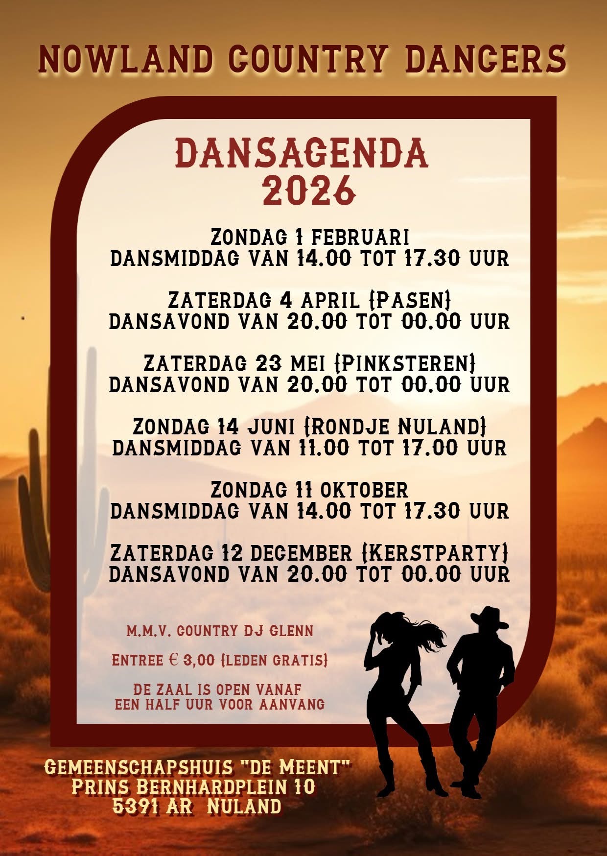 Wij organiseren regelmatig dansmiddagen of dansavonden waarbij de muziek (voornamelijk country) verzorgd wordt door onze DJ Glenn, hij draait ook verzoekjes.